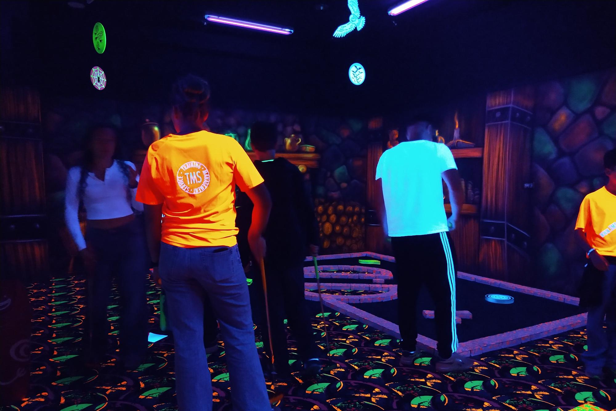Am Nachmittag sind alle in die Autos gestiegen, um zum Glowgolf nach Wildemann zu fahren. Dort hatten wir die ganze Halle für uns, denn es wurde extra für uns früher geöffnet!