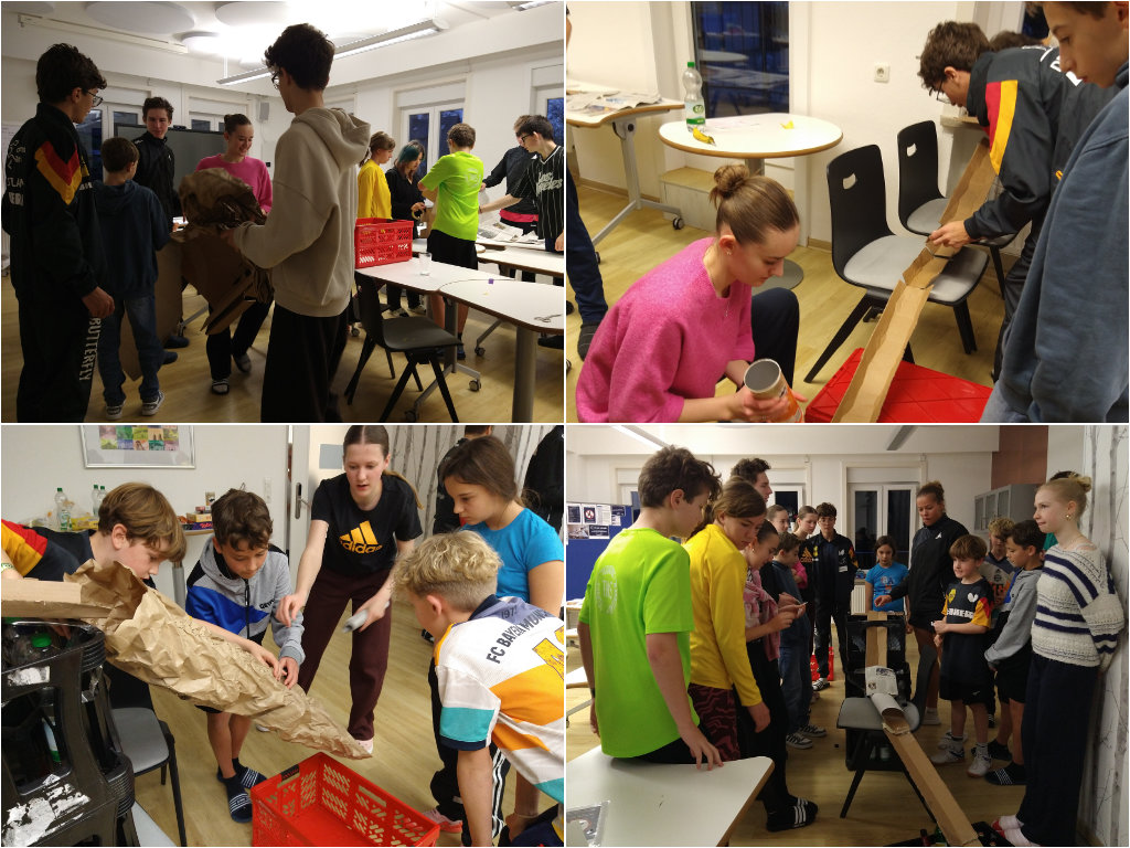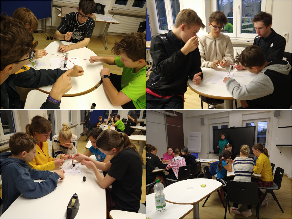 Während die Erwachsenen am Samstagnachmittag in der Halle schwitzten und anschließend im See neben der Halle ein Eisbad nahmen, hat Thomas mit den Jugendspieler/-innen zwei lustige Kooperationsspiele im Seminarraum veranstaltet. Zuerst mussten sie in Kleingruppen mit einem Edding bestimmte Symbole und Bilder malen. Jeder aus der Gruppe hatte dabei einen Faden in der Hand, der an dem Edding befestigt wurde. Die gemalten Ergebnisse waren dabei ganz unterschiedlich!